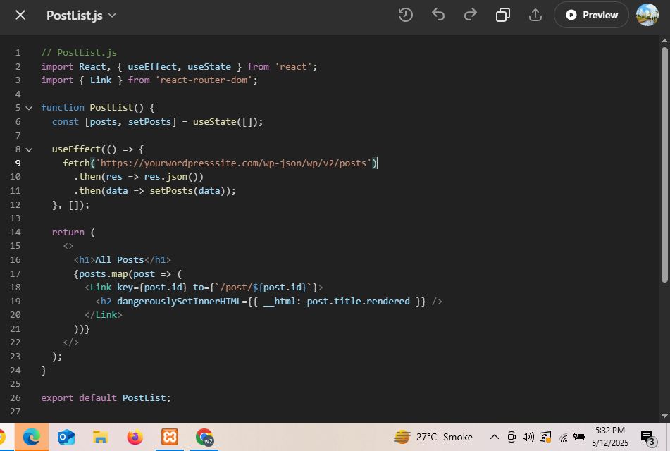 fetch('https://yourwordpresssite.com/wp-json/wp/v2/posts')
